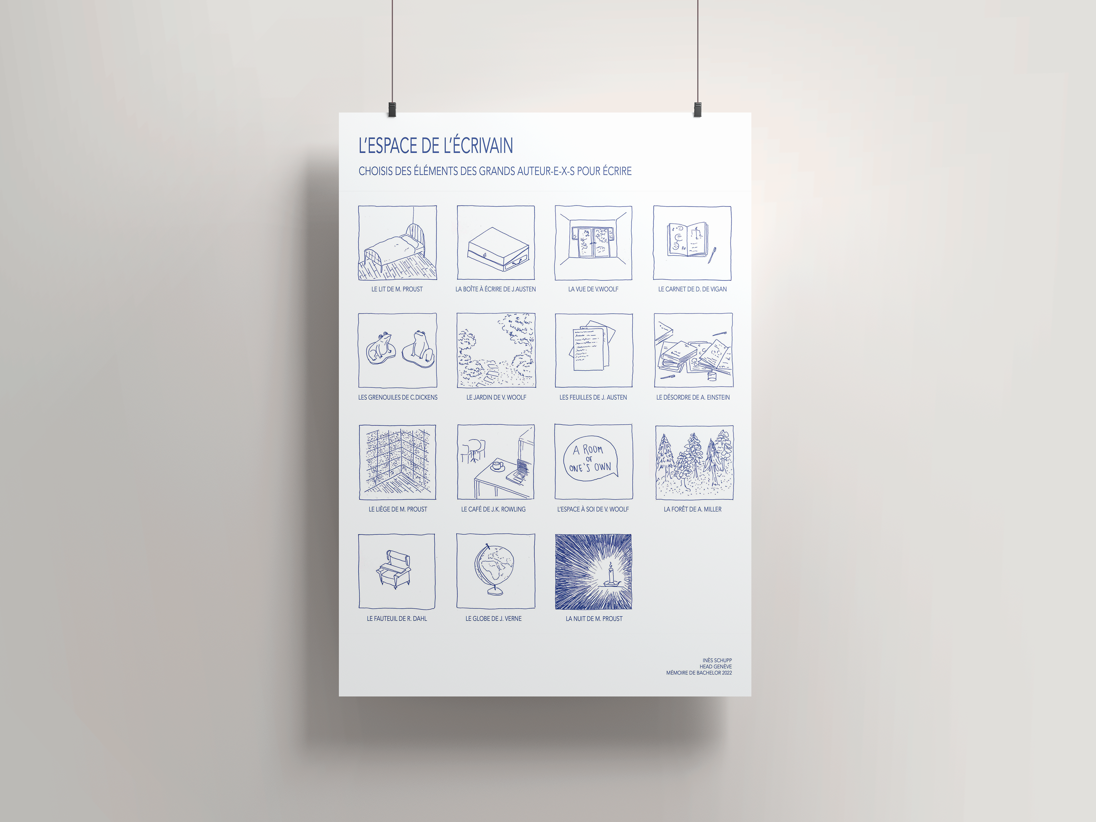 When interest in the interior grew in the nineteenth century, writers' spaces were studied extensively, both by researchers and readers. Various studies have demonstrated the relevance of studying the writer's space and invite a new interpretation of the text. As part of my Bachelor's dissertation, I decided to reverse the research conducted by literary specialists and authors and study this subject from a new perspective, that of an interior designer. My work initially sought to determine whether it is possible to define an architecture of writing. By analysing the spaces of great authors such as Virginia Woolf, Jane Austen and Marcel Proust, I ultimately found it more relevant to redirect my research towards the following question: how do architecture and design respond to the psychological, philosophical or even political needs of the writer?