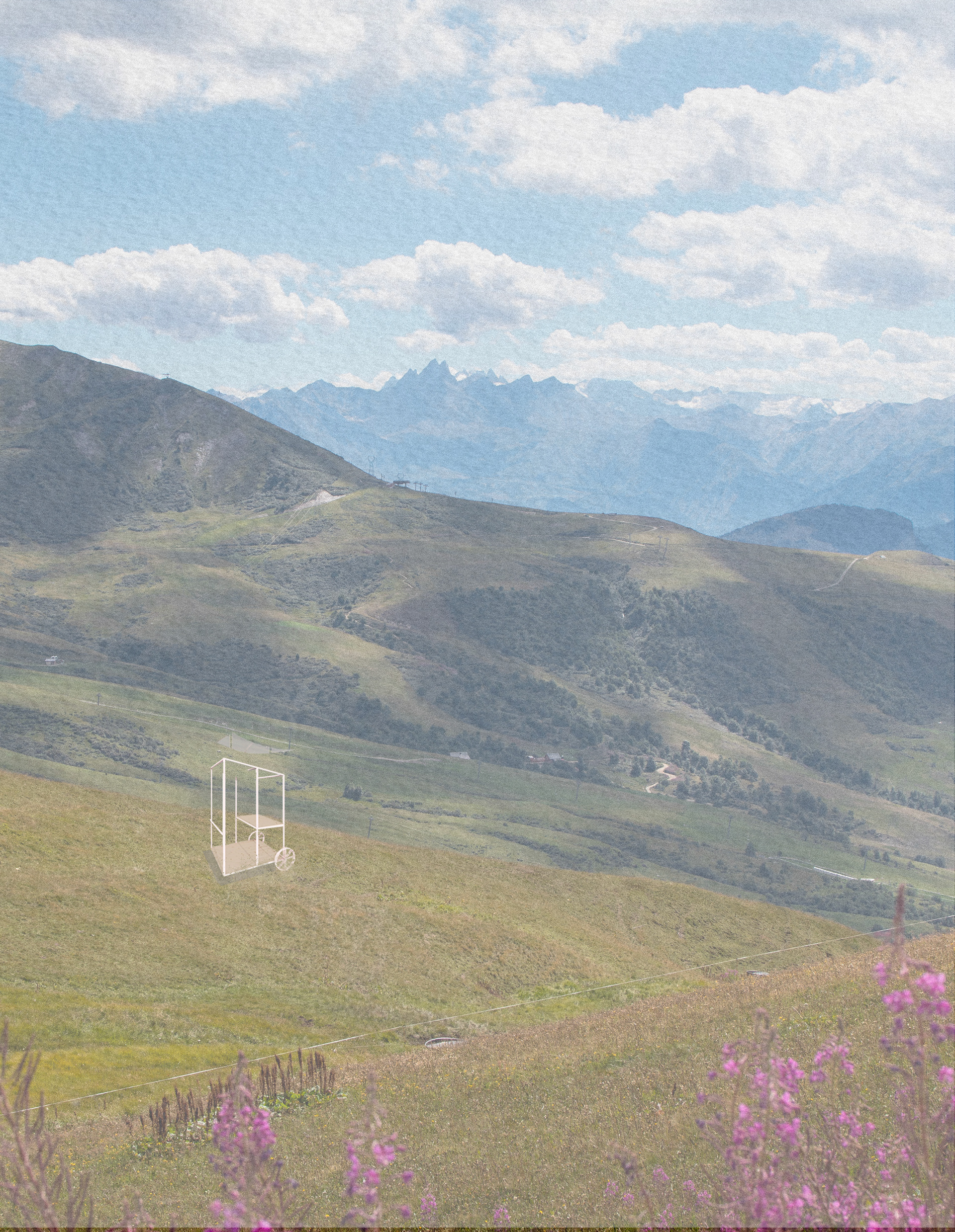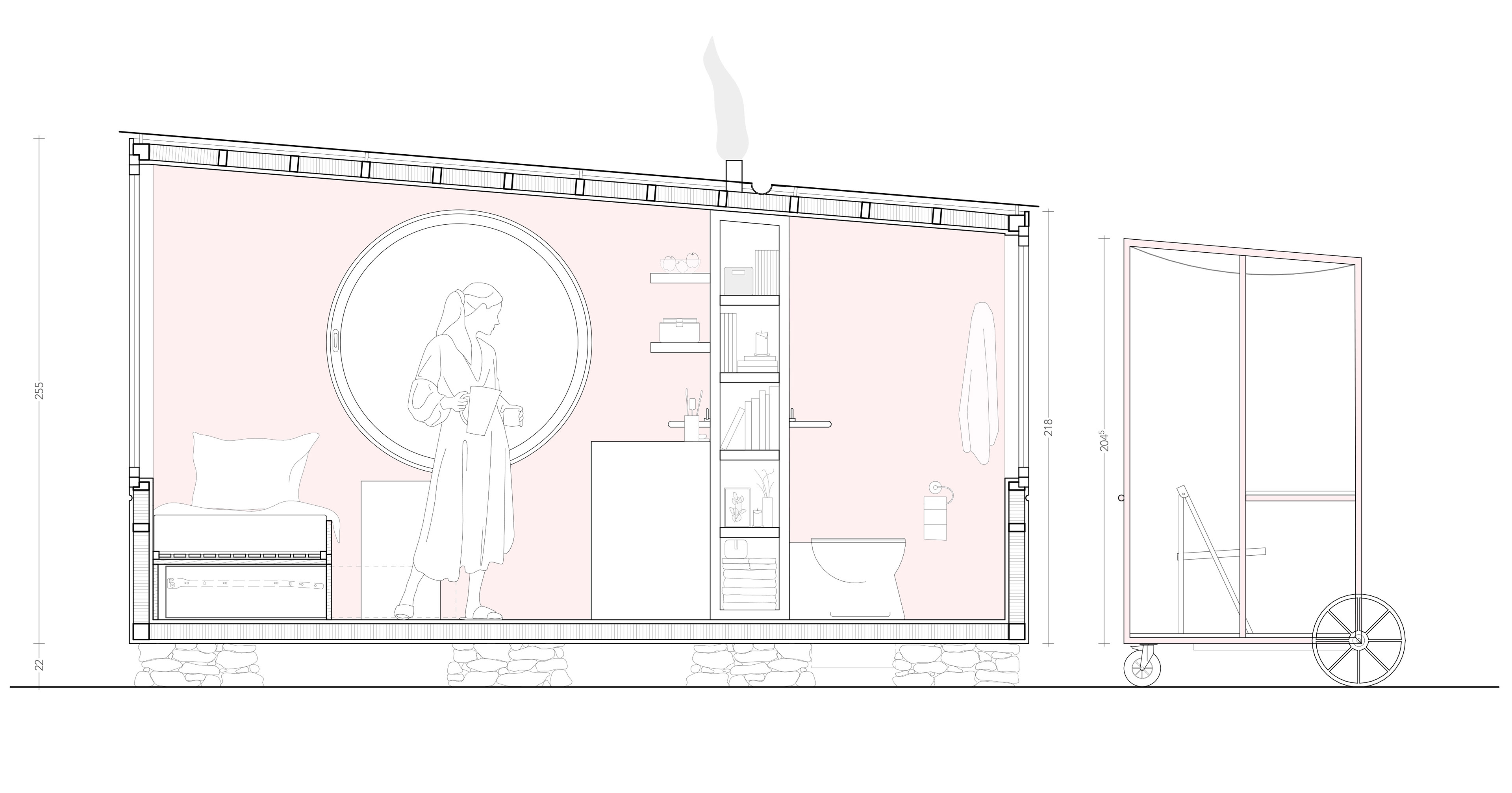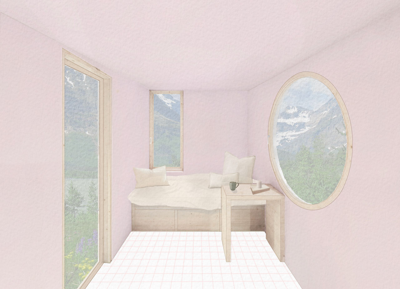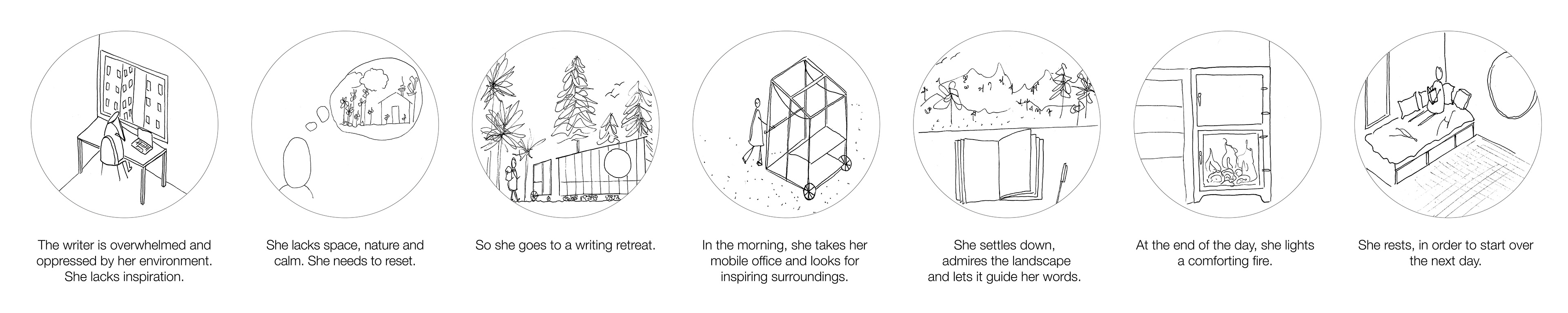 This cabin is destined for writers or any creative person looking for inspiration and peace in proximity to nature. It consists of two elements: a shelter and a mobile office which both house different functions, but both reflect a tender atmosphere due to materiality and simplicity.