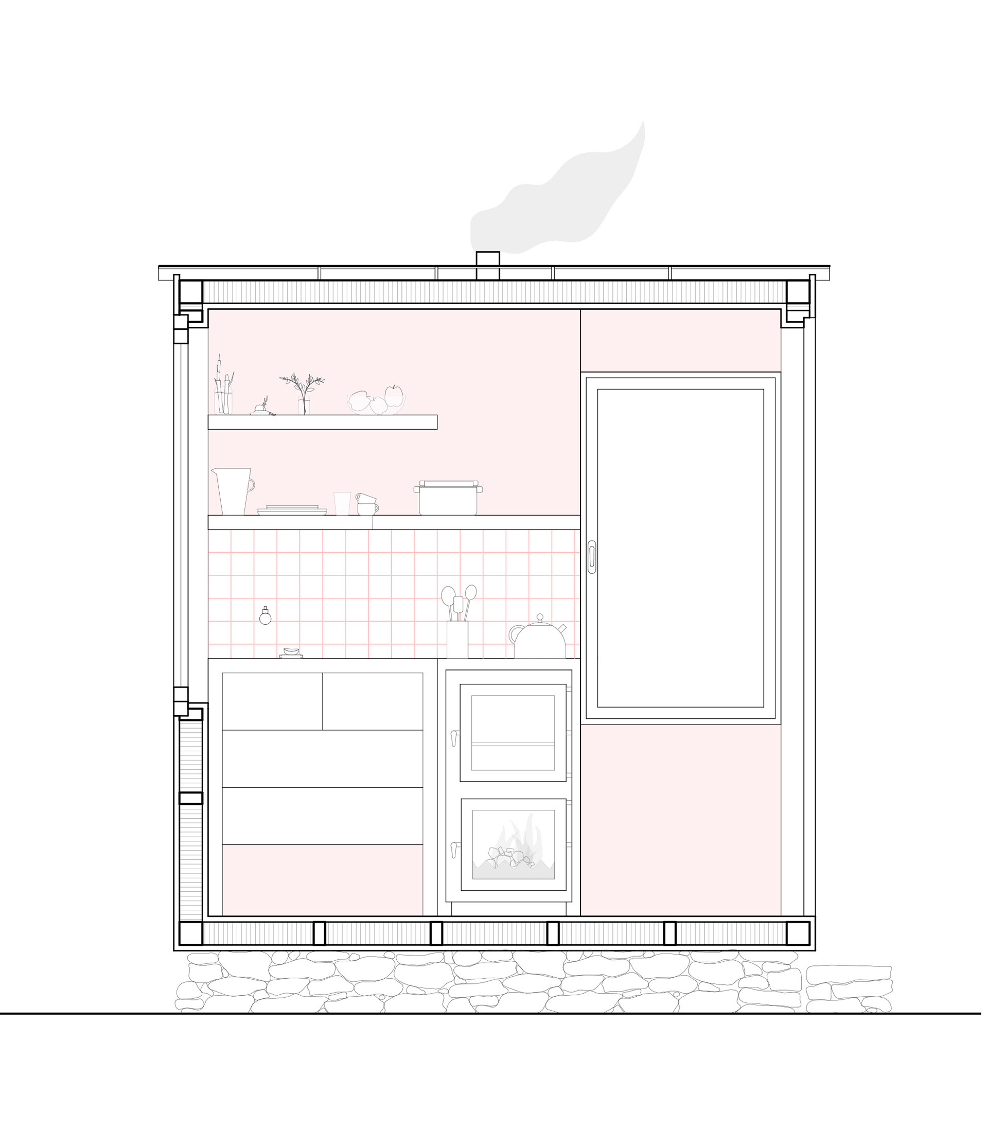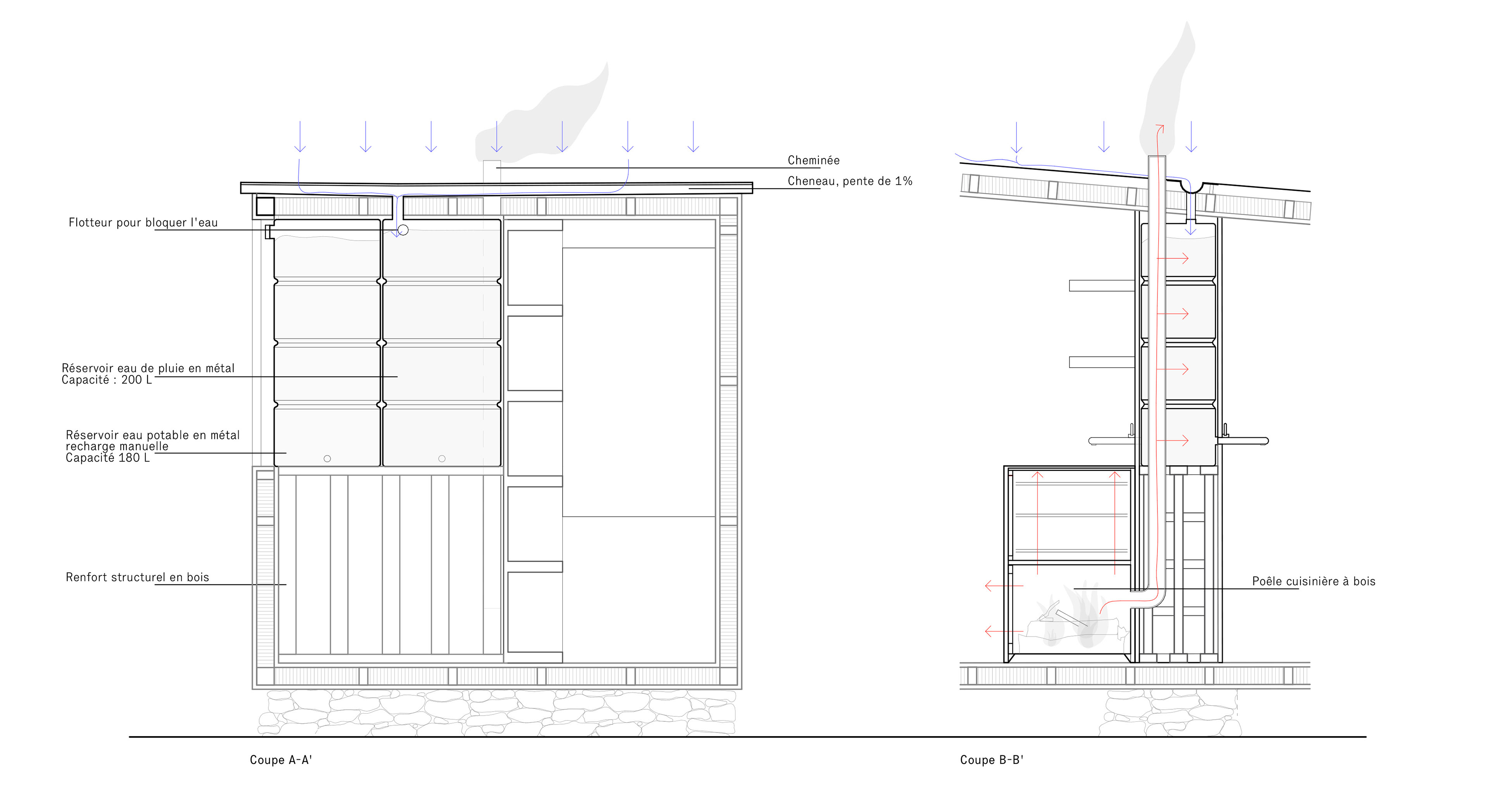 the single-slope roof allows rainwater to be collected. A wood-burning cooker, located in the centre of the space, heats the room as well as the water.