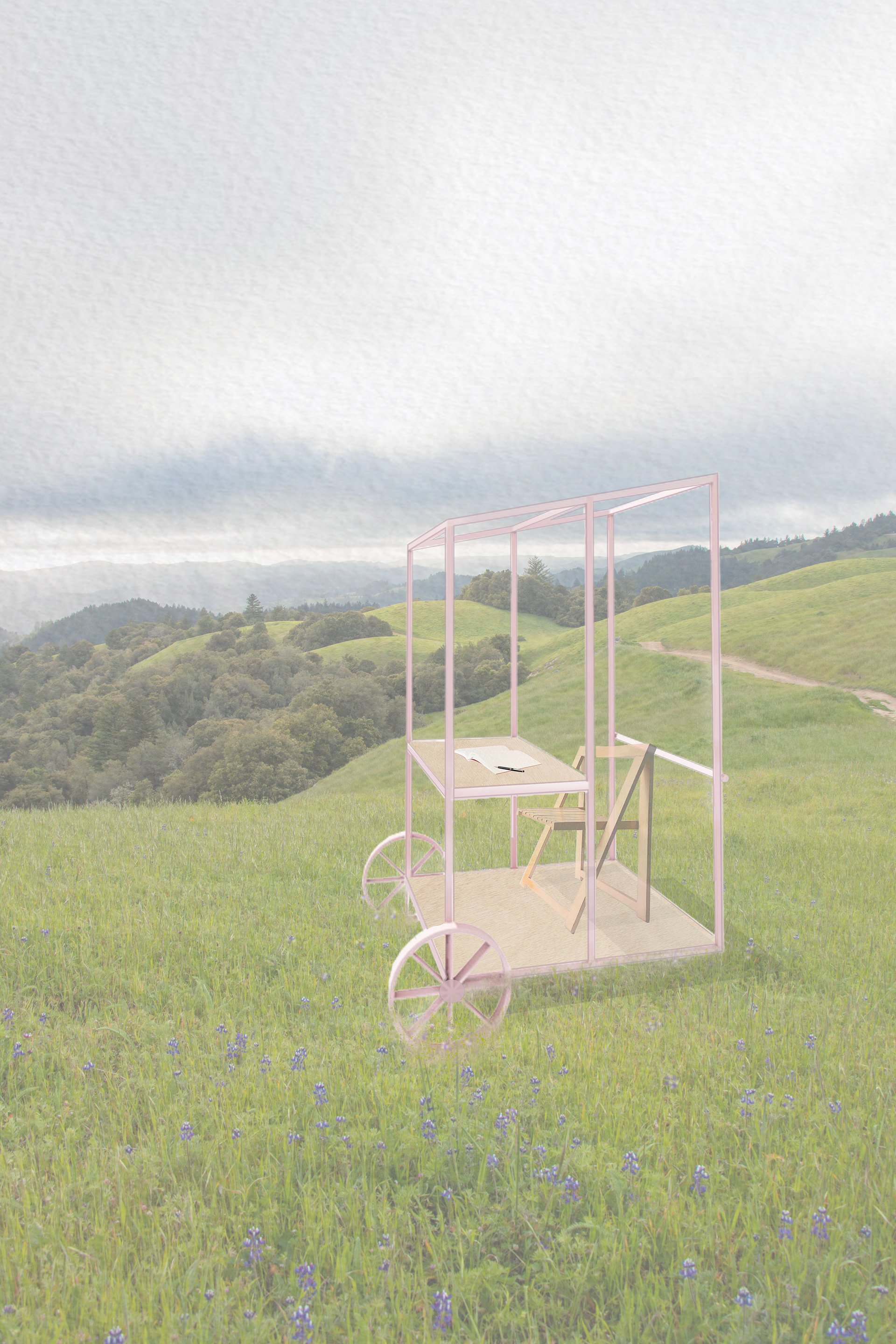 The mobile office, a light metallic structure, provides the writer with the opportunity to choose a new environment each day for inspiration.
