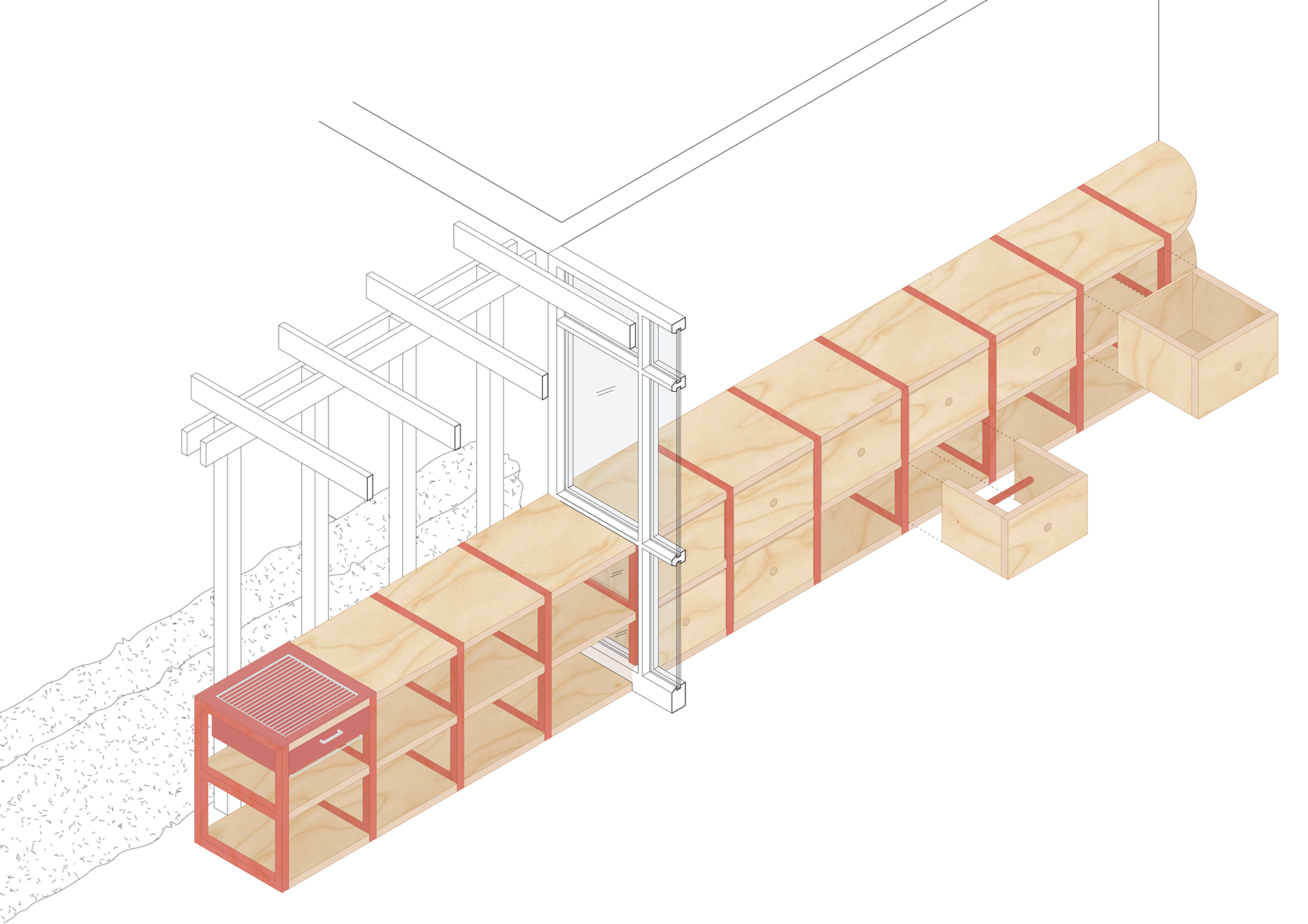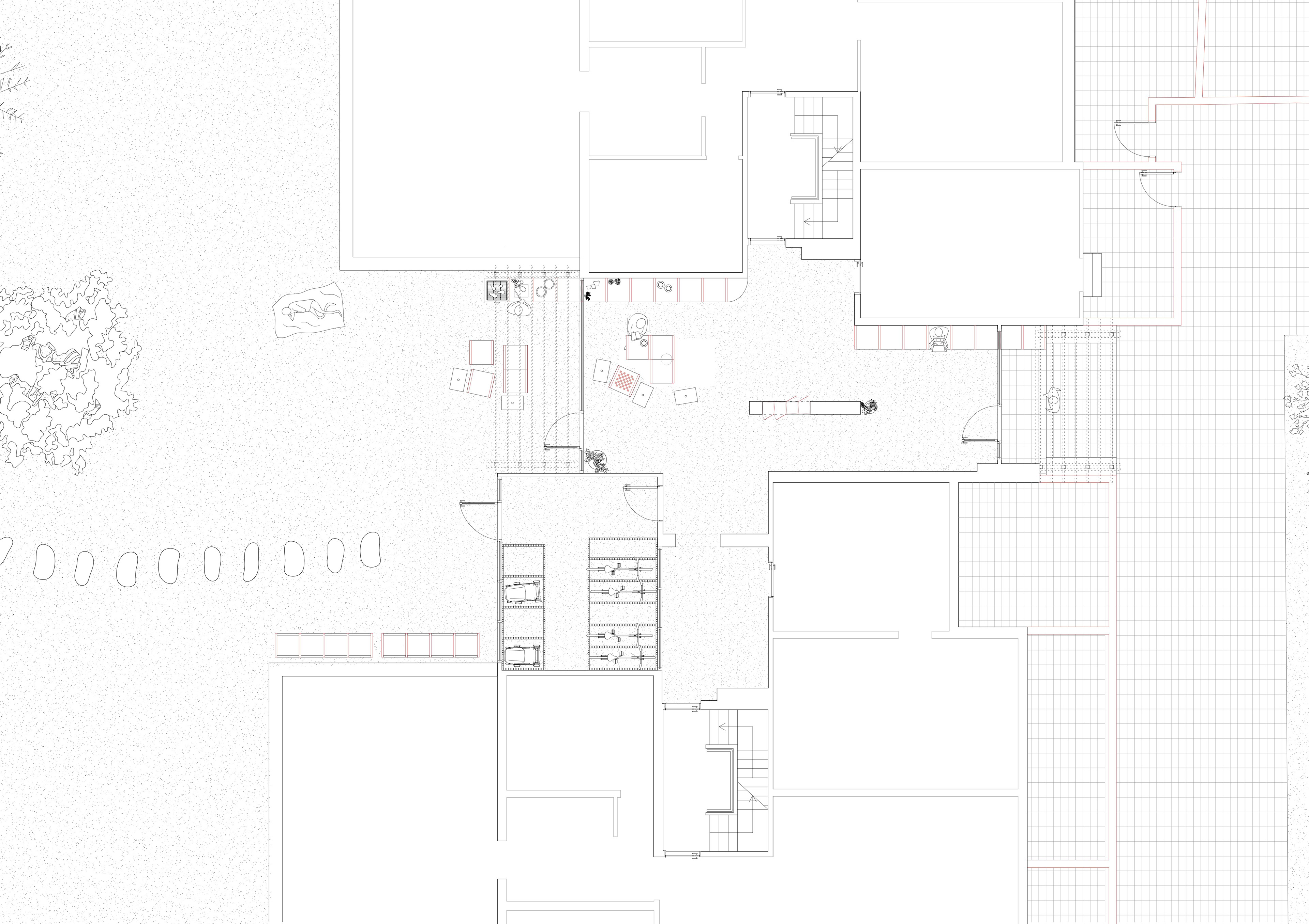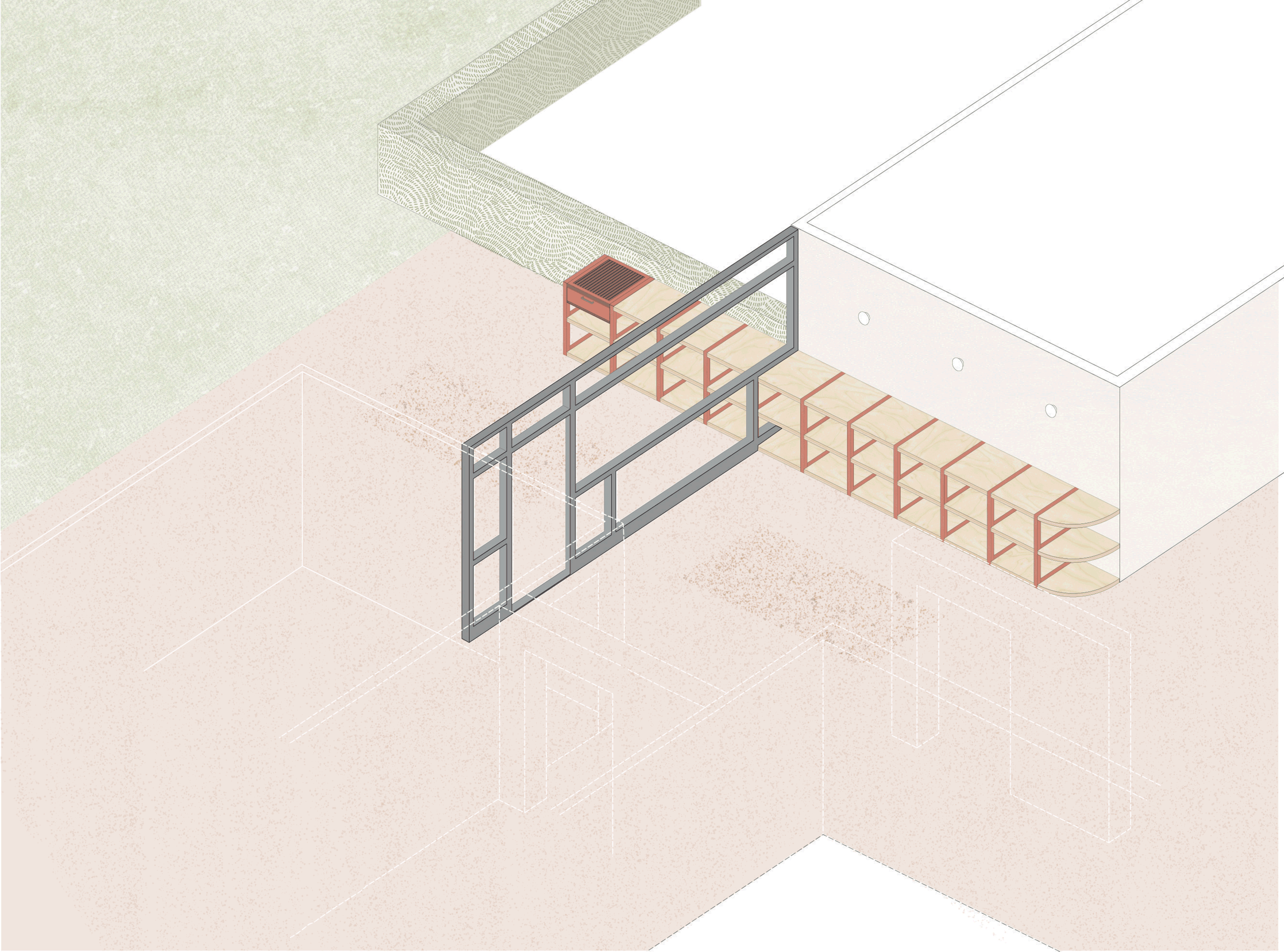To fight against the social difficulties and lack of connection in the area, this proposal offers the possibilities and spaces for people to get together as a way to strengthen neighbourship and encourage community. After restoring the original doors, transforming the interior spaces and materiality, our proposal adds a set of furniture, inspired by the grid of the current architecture. These pieces create a sense of domesticity in the entrances, so that the resident can consider these areas as an extension of their homes. They are also designed to offer common and private storage and also places to share objects, as well as moments.